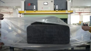 Compressing the assembled sofa using industrial vacuum machines and rolling systems. -